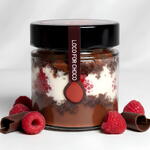 Una fantástica mezcla de mousse de chocolate y crema de anacardos con coco, con frambuesas frescas sobre un bizcocho de chocolate sin gluten. Una explosión de sabores en cada bocado. 100% de origen vegetal, sin gluten, sin lácteos y sin azúcar refinada.