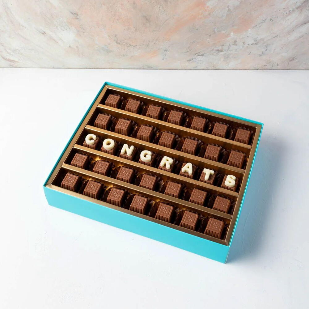 YOUR GIFT CONTAINS Approx. 500 grams pure Belgian milk chocolate Text: 6 / 12 letters with 6 letter in in each row Flavors: Pure Belgian Milk chocolate Box dimensions: LxBxH: 31×25.5x6cm HANDLING AND STORAGE Keep away from direct heat and sunlight All our products are made to order and we suggest to store then in a cool dry place PREPARED IN A FACILITY WHERE NUTS ARE USED