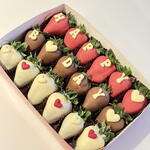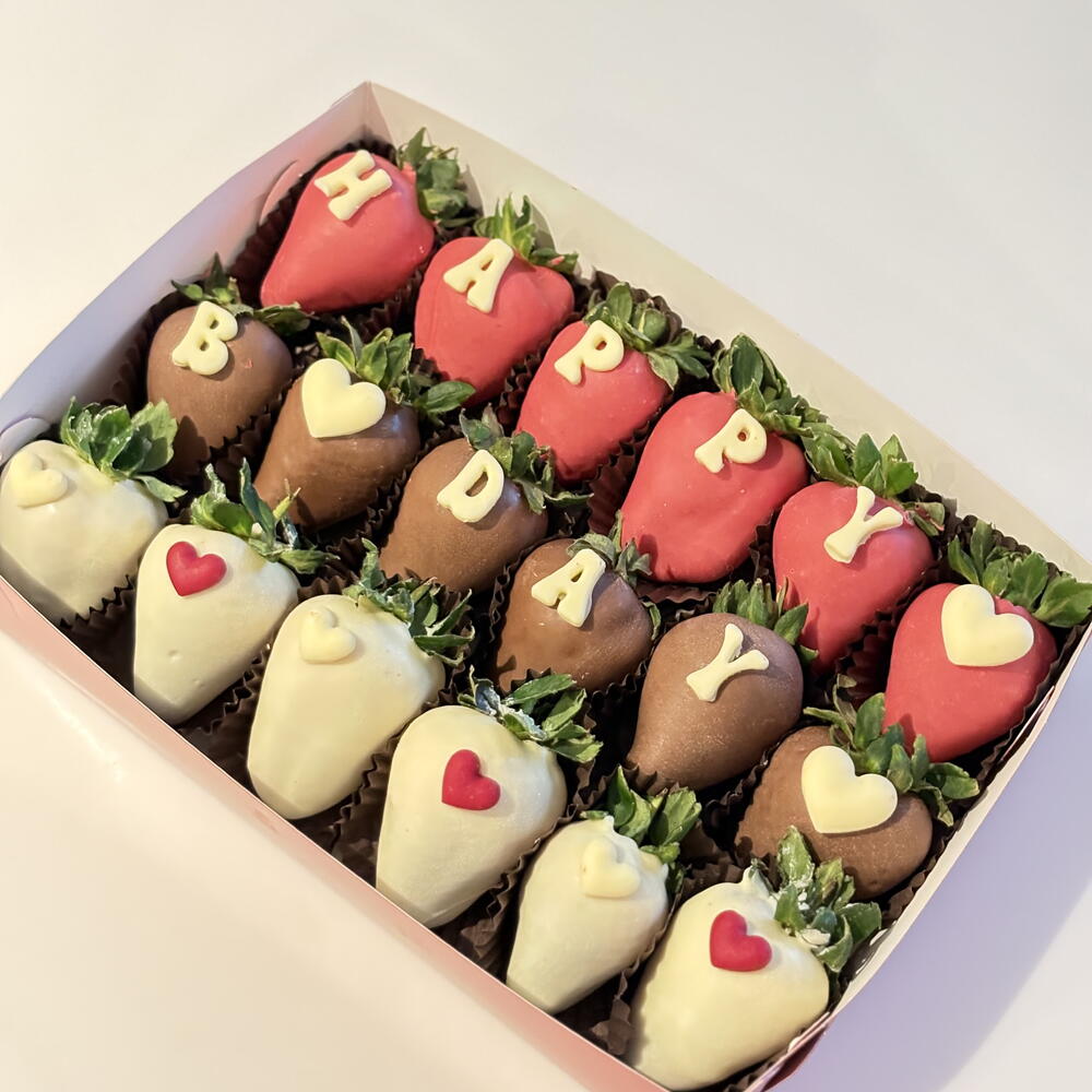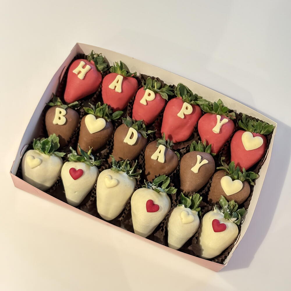 Dale un toque extra dulce a tus cumpleaños con nuestras fresas cubiertas de chocolate "Feliz Cumpleaños": ¡la combinación perfecta de amor, sabor y celebración! Cada fresa fresca y jugosa está bañada a mano en capas de rico chocolate con leche, blanco cremoso y rojo rubí, y decorada con letras comestibles y corazones que forman la frase "FELIZ CUMPLEAÑOS". Estas delicias no solo son deliciosas, sino que también se presentan en una hermosa caja lista para regalar, una forma elegante y considerada de sorprender a alguien especial en su gran día.