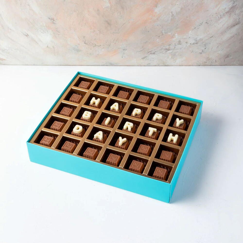 YOUR GIFT CONTAINS Approx. 500 grams pure Belgian milk chocolate Text: 6 / 12 letters with 6 letter in in each row Flavors: Pure Belgian Milk chocolate Box dimensions: LxBxH: 31×25.5x6cm HANDLING AND STORAGE Keep away from direct heat and sunlight All our products are made to order and we suggest to store then in a cool dry place PREPARED IN A FACILITY WHERE NUTS ARE USED