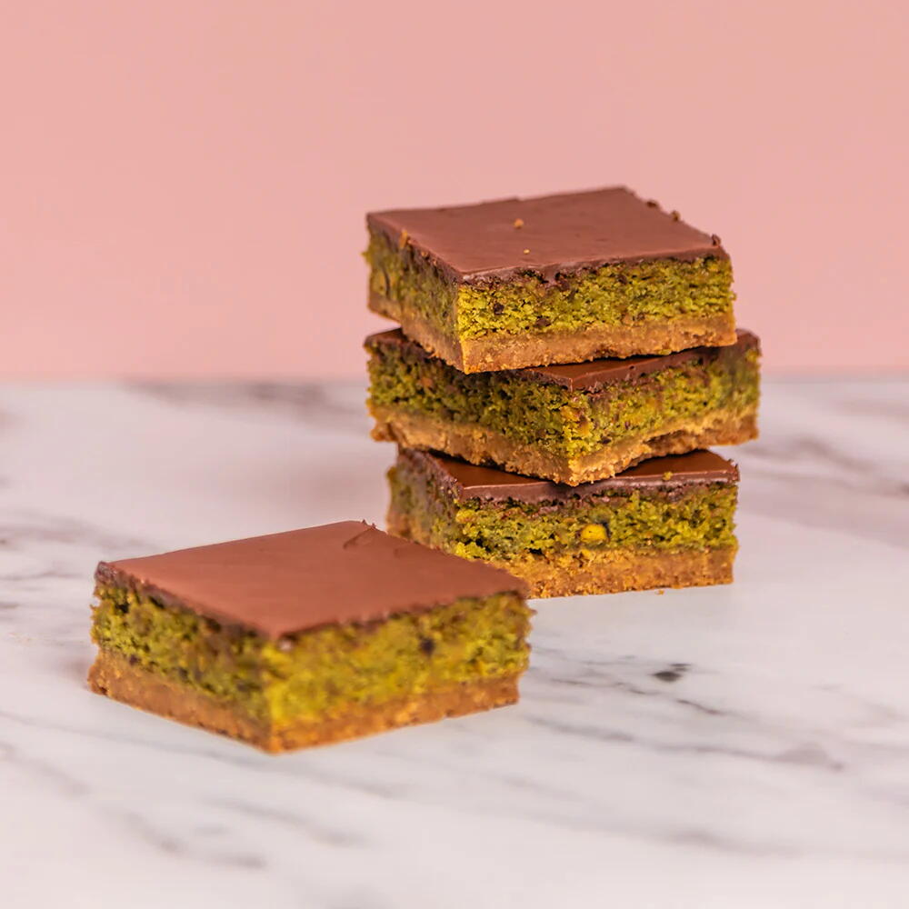 Una base de galleta graham, bizcocho de pistacho esponjoso y una gruesa capa de Nutella... transmite lujo. Se vende por unidad.