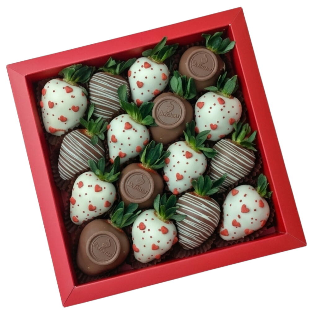 Di “Te amo” sin palabras. Fresas frescas cubiertas de chocolate belga con leche y chocolate blanco, rematadas con delicadas rayas y corazones de chocolate. Romántico, juguetón e intemporal — el regalo perfecto para el amor en todas sus formas.