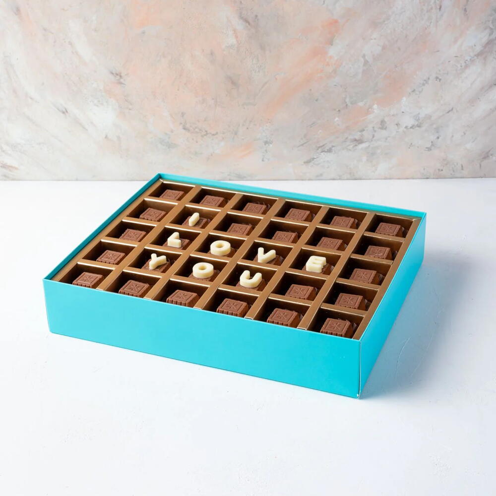Detalles SU REGALO CONTIENE Aprox. 500 gramos de chocolate belga puro con leche Texto: 6/12 letras con 6 letras en cada fila Sabores: Chocolate belga puro con leche Dimensiones de la caja: Largo x Ancho x Alto: 31 x 25,5 x 6 cm MANIPULACIÓN Y ALMACENAMIENTO Mantener alejado del calor directo y la luz solar. Todos nuestros productos se elaboran bajo pedido y recomendamos almacenarlos en un lugar fresco y seco. Elaborado en una planta donde se utilizan frutos secos.
