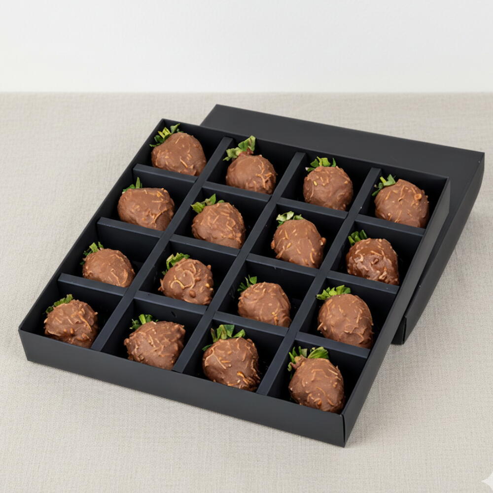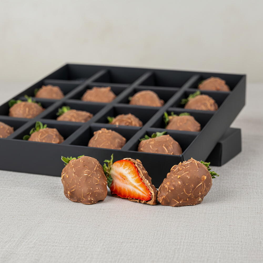 Una fusión decadente de sabores—fresas frescas envueltas en kunafa crujiente, cubiertas con suave chocolate con leche. De tamaño perfecto para un bocado, esta caja de 16 piezas es ideal para compartir o regalar. Una elección deliciosa para ocasiones festivas como Ramadán, Eid, San Valentín o Navidad, y una forma dulce de celebrar cumpleaños, aniversarios o reuniones familiares durante todo el año.