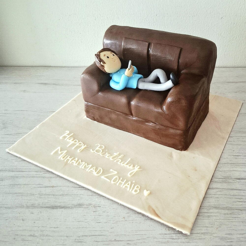 El pastel Hombre en el sofá es un diseño temático de sofá, hilarante y muy detallado, que transmite pura relajación. Perfecto para cumpleaños, el Día del Padre o sorpresas solo por diversión, este pastel garantiza risas y recuerdos deliciosos. Rinde para 6-8