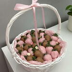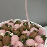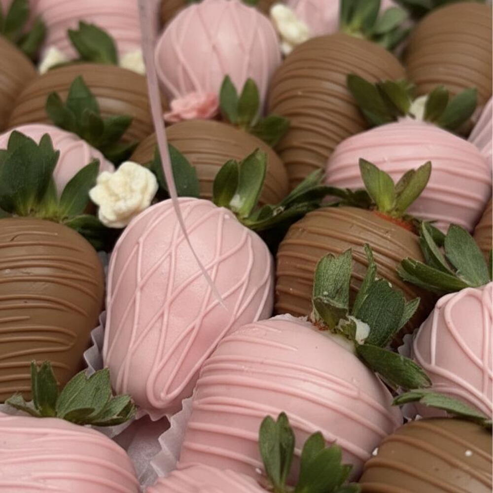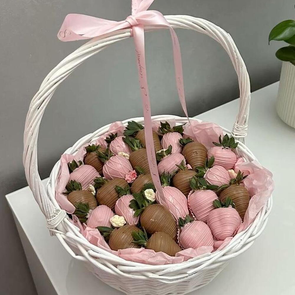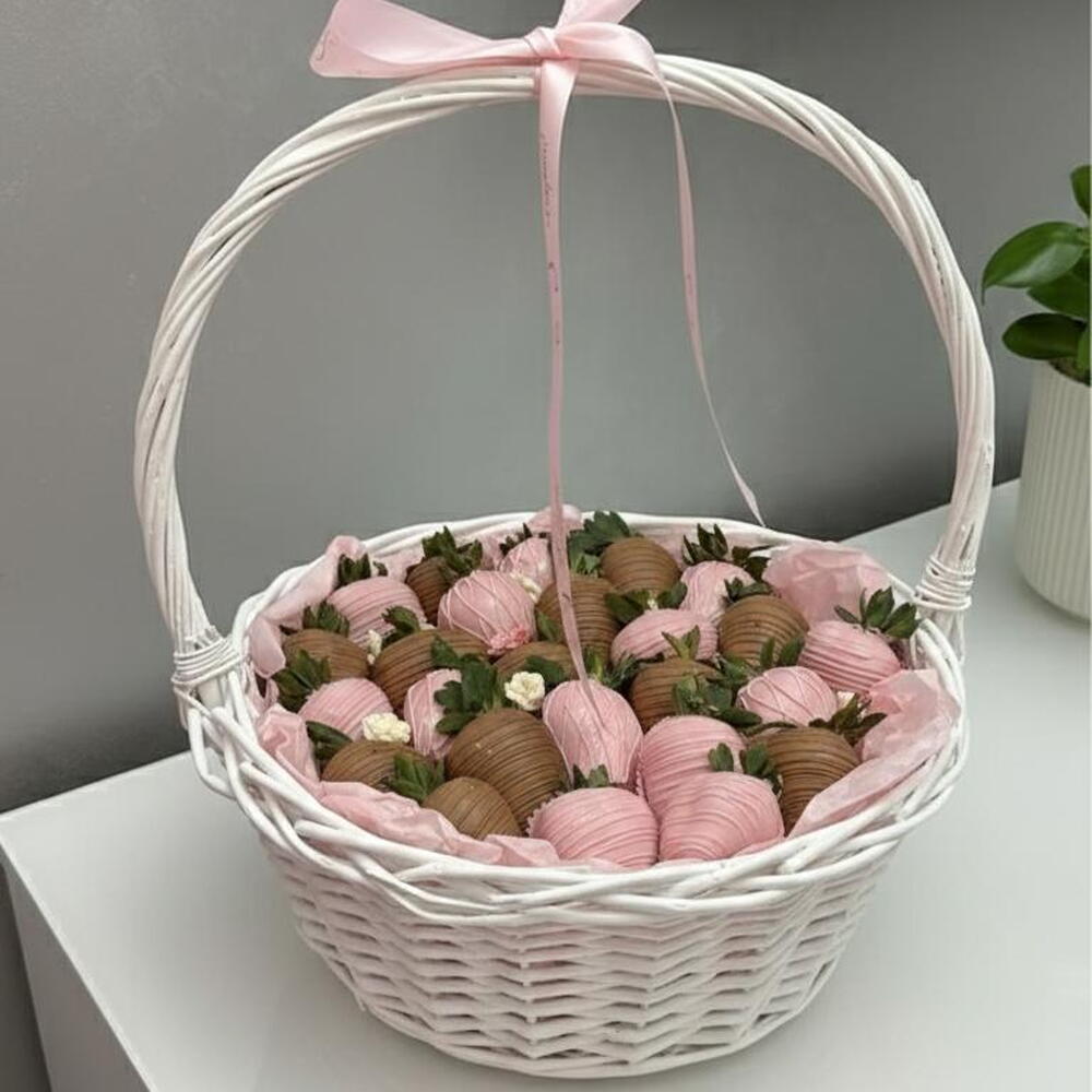 Una elegante cesta de fresas frescas bañadas en suave chocolate con leche y chocolate blanco rosa, dispuestas de forma hermosa para un regalo dulce y con estilo. Cada fresa está decorada a mano y presentada en una delicada cesta con suaves acentos rosados, lo que la hace perfecta para cumpleaños, aniversarios o sorpresas románticas. Ingredientes: Fresas frescas, chocolate con leche, chocolate blanco, colorante alimentario, decoraciones comestibles.