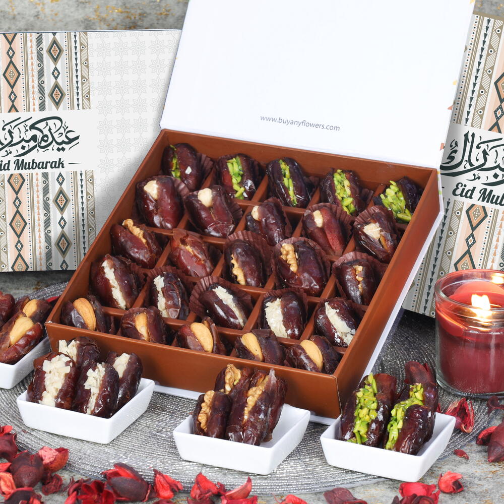 Detalles del producto:-Dátiles rellenos surtidos, Sabores - Pistacho, Cáscara de naranja, Anacardo, Nuez y Avellana, Cantidad - 25 unidades, Presentados en una hermosa caja de regalo de Ramadán