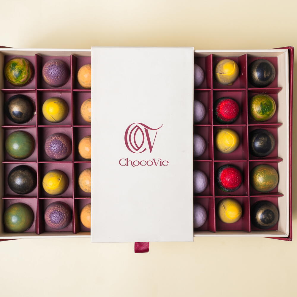 Un elegante surtido de 40 chocolates artesanales con una variedad de sabores exclusivos.