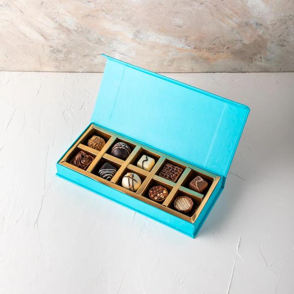 Your Gift Contains: 10 pieces assorted chocolates in Milk, Dark and White chocolate – Lotus – Hazelnut – Pistachio – Salted Caramel – Peanut Butter Box/Tray Size: LxBxH: 25x12x4cm HANDLING AND STORAGE Keep away from direct heat and sunlight Keep it refrigerated Suitable for vegetarians PREPARED IN A FACILITY WHERE NUTS ARE USED