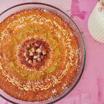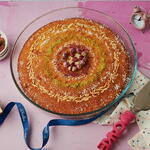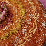 Postre de Oriente Medio hecho con sémola, azúcar, yogur y coco, infundido con cardamomo y azafrán y cubierto con frutos secos mixtos.
