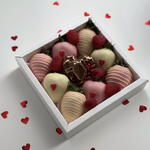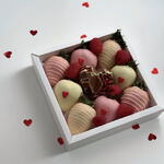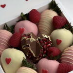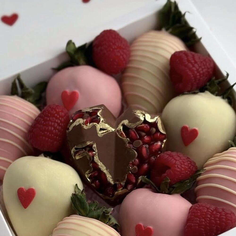 Celebra el amor con nuestra Caja de Regalo Especial de Fresas con Chocolate para San Valentín, una colección romántica elaborada para hacer derretir los corazones. Esta elegante caja incluye fresas frescas y jugosas bañadas a mano en chocolate premium con leche, negro y blanco, rematadas con un delicado adorno de chorritos en suaves tonos de San Valentín. Acompañadas de frambuesas frescas y un centro de chocolate gourmet de autor relleno de arilos de granada, cada bocado es una mezcla de dulzura, frescura y placer. Dispuesta de forma hermosa para una presentación lujosa, esta edición de San Valentín es perfecta para regalar a tu pareja, sorprender a alguien especial o añadir un toque romántico a tu celebración.