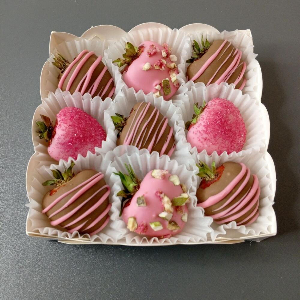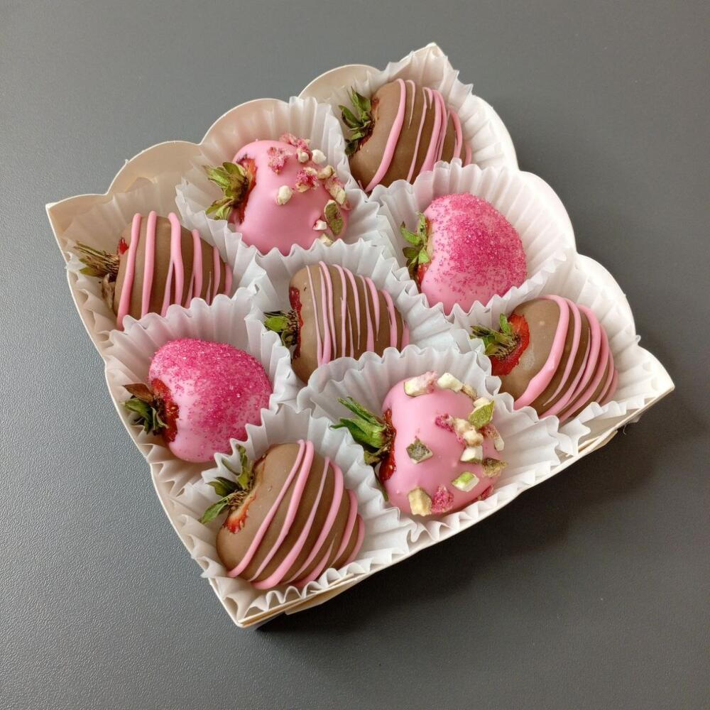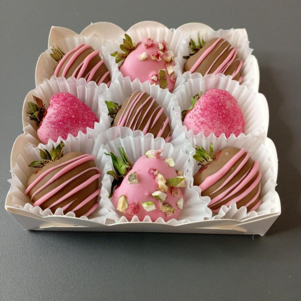 Fresas en chocolate 9 unidades. Chocolate: con leche, rosa. Chispitas, higos liofilizados, azúcar roja. Desaconsejamos encarecidamente el envío de este producto a otras ciudades - ninguna empresa de mensajería asegura productos alimentarios. Si el chocolate se rompe o se derrite dentro de la caja, no habrá cambio ni devolución del producto. Vida útil: 1 día Es mejor consumirlo dentro de las primeras 10-12 horas y conservarlo a una temperatura de +10 ... +20 grados. Durante las siguientes 12 horas, guardar únicamente en el refrigerador a una temperatura de +5 ... +10 grados. Dejar a temperatura ambiente durante 10-15 minutos antes de usar.