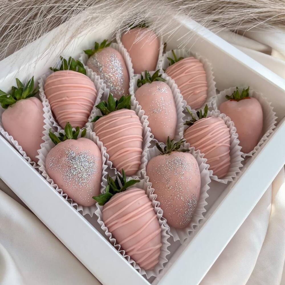 Una encantadora caja de 12 fresas, elegantemente cubiertas de exquisito chocolate rosa. Deliciosamente dulce y visualmente impresionante, este capricho es perfecto para ocasiones especiales o como un regalo sincero!