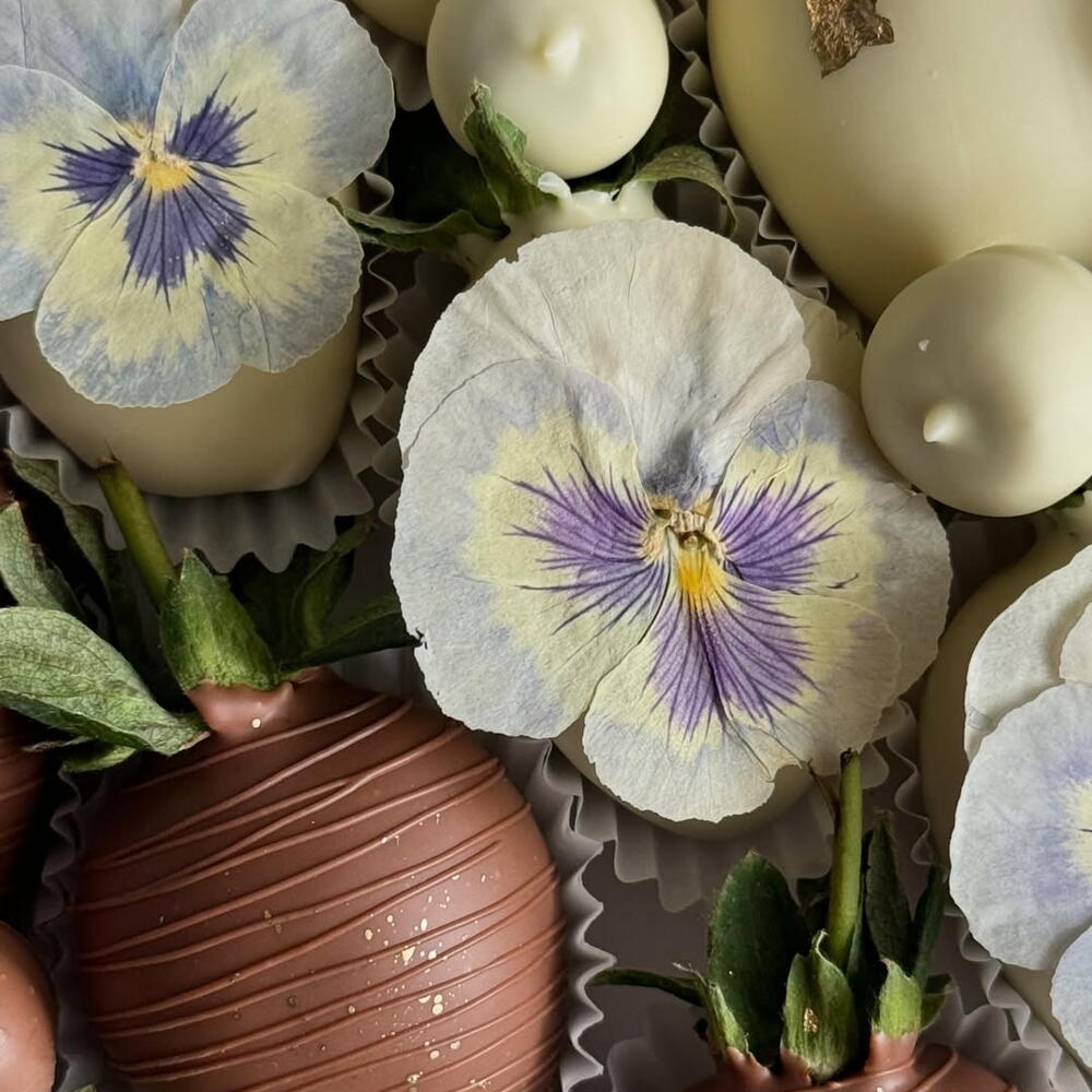 Base de fruta fresca • Fresas frescas premium (grandes) • Arándanos frescos Cobertura de chocolate • Cobertura de chocolate blanco belga • Cobertura de chocolate con leche belga Frutas bañadas en chocolate • Fresas cubiertas de chocolate blanco • Fresas cubiertas de chocolate con leche • Fresas con chocolate cubiertas de nueces • Fresas con chocolate • Arándanos cubiertos de chocolate blanco Coberturas y rellenos • Frutos secos tostados triturados (cacahuetes/avellanas) • Flores prensadas comestibles (pensamiento/viola) • Detalles de chocolate