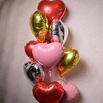 Conjunto vibrante de 11 globos de foil con forma de corazón en colores románticos rojo, dorado, plateado y rosa suave. Inflados con helio y lastrados en la parte inferior. Tiempo de flotación: 8–10 horas.