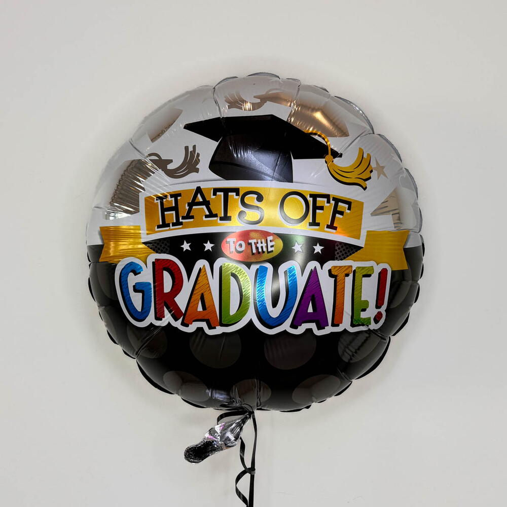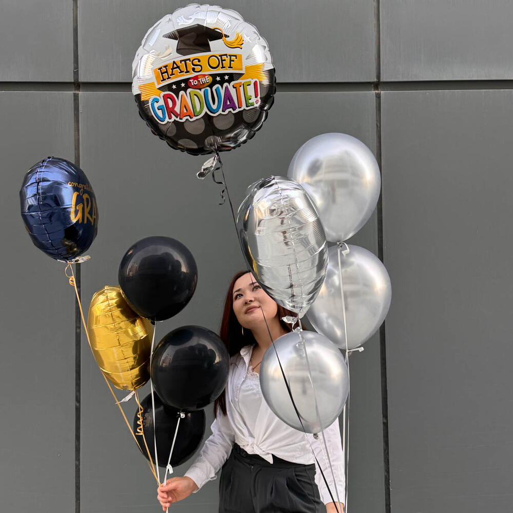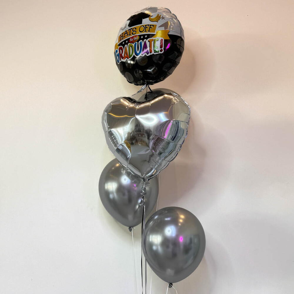 1 globo metalizado para graduación, 1 globo metalizado en forma de corazón plateado y 3 globos de látex plateados para graduación. Todos con helio
