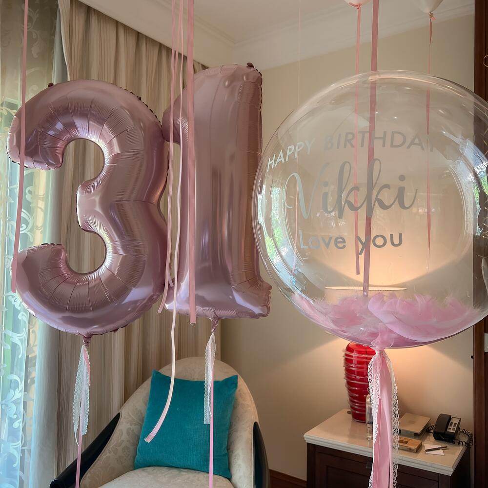 El set incluye: - 30 globos para techo con cinta de satén - 5 ramos de globos - 2 números - globo burbuja con texto personalizado