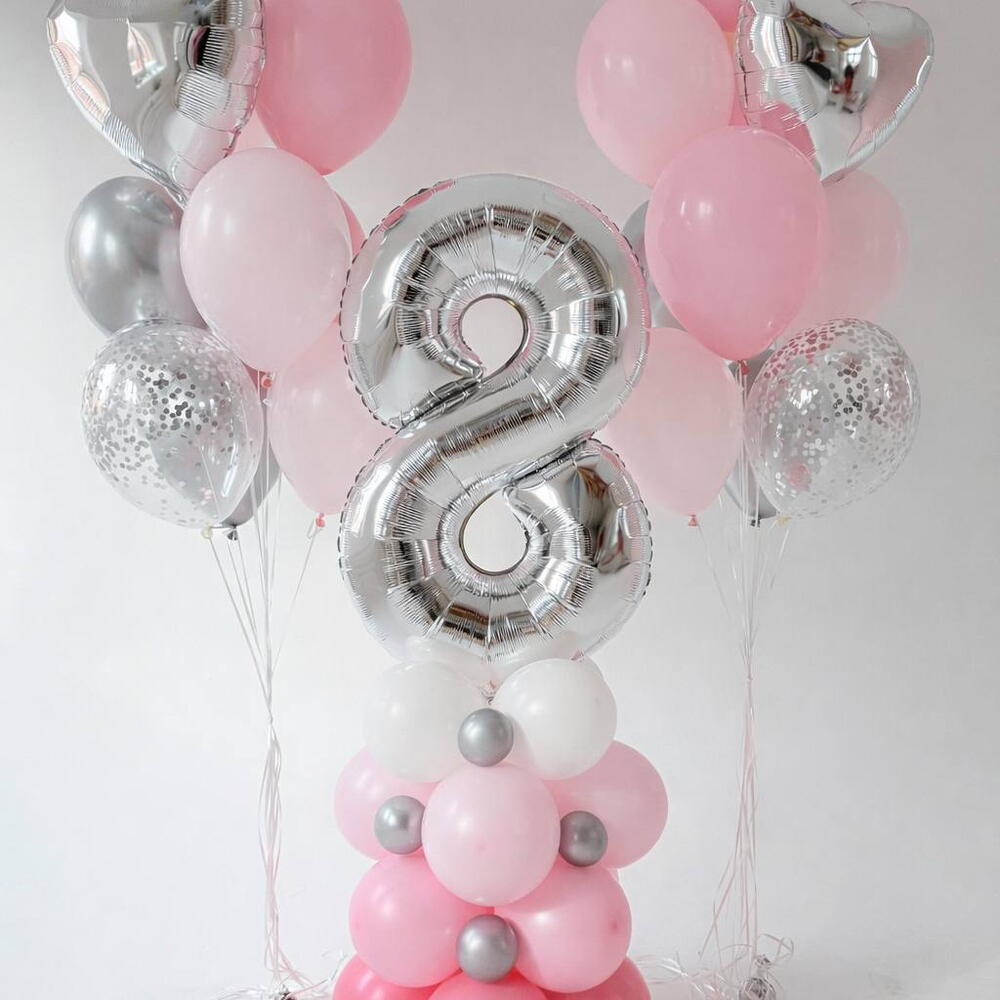 Set includes : - 2 bunches 10 balloons each - number 8 on balloon base