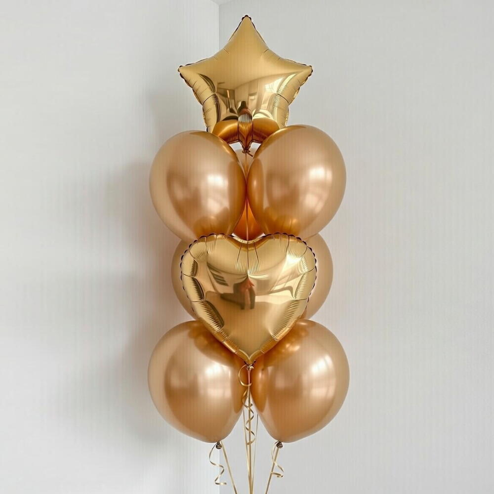 Quantity 1 × Gold Star Foil Balloon 1 × Gold Heart Foil Balloon 7 × Gold Chrome Latex Balloons A fresh and elegant Gold Balloon Bouquet featuring a striking metallic star balloon paired with a matching heart-shaped foil balloon, surrounded by glossy chrome latex balloons for a full and balanced look. This arrangement creates a playful yet refined statement, perfect for birthdays, baby boy celebrations, welcome baby events, graduations, or modern themed parties. Delivered fully inflated with helium, professionally arranged, and finished with coordinating blue ribbons and a secure balloon weight. Helium Float Time Foil Balloons: 2–3 days (indoor use) Latex Balloons: 8–12 hours