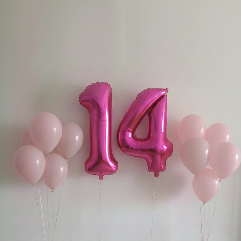 Celebra con elegancia usando este set de globos rosa número catorce. Incluye un globo número catorce rosa metalizado de 40 pulgadas y 10 globos de látex de 12 pulgadas, inflados con helio y perfectos para la decoración de cumpleaños y las fotos.