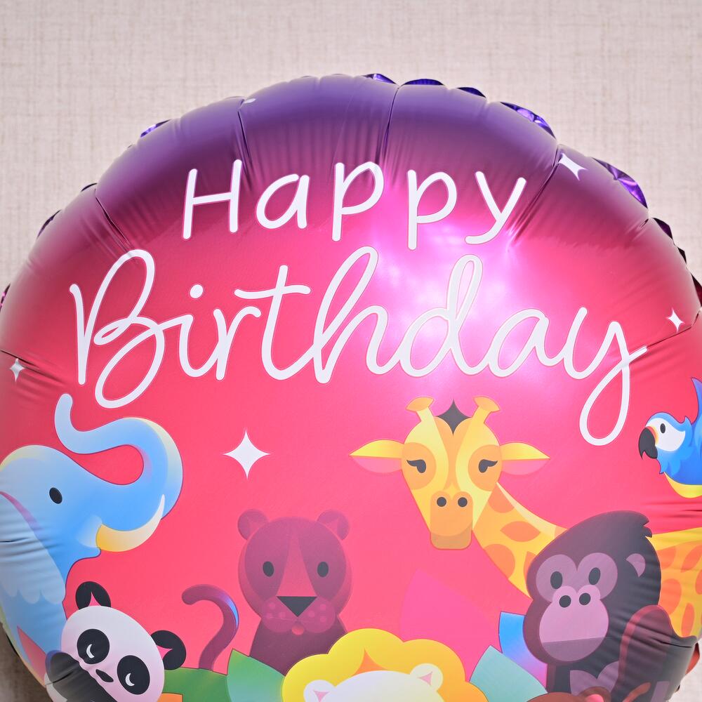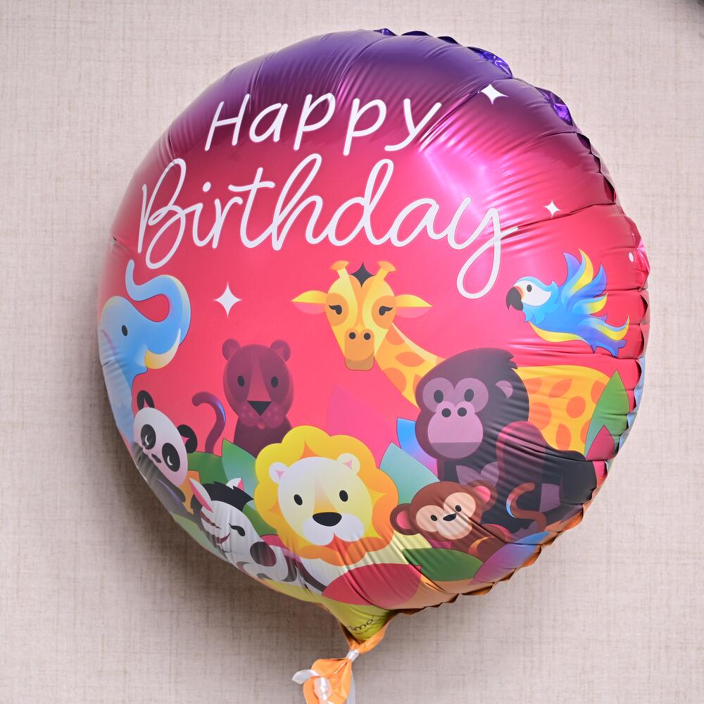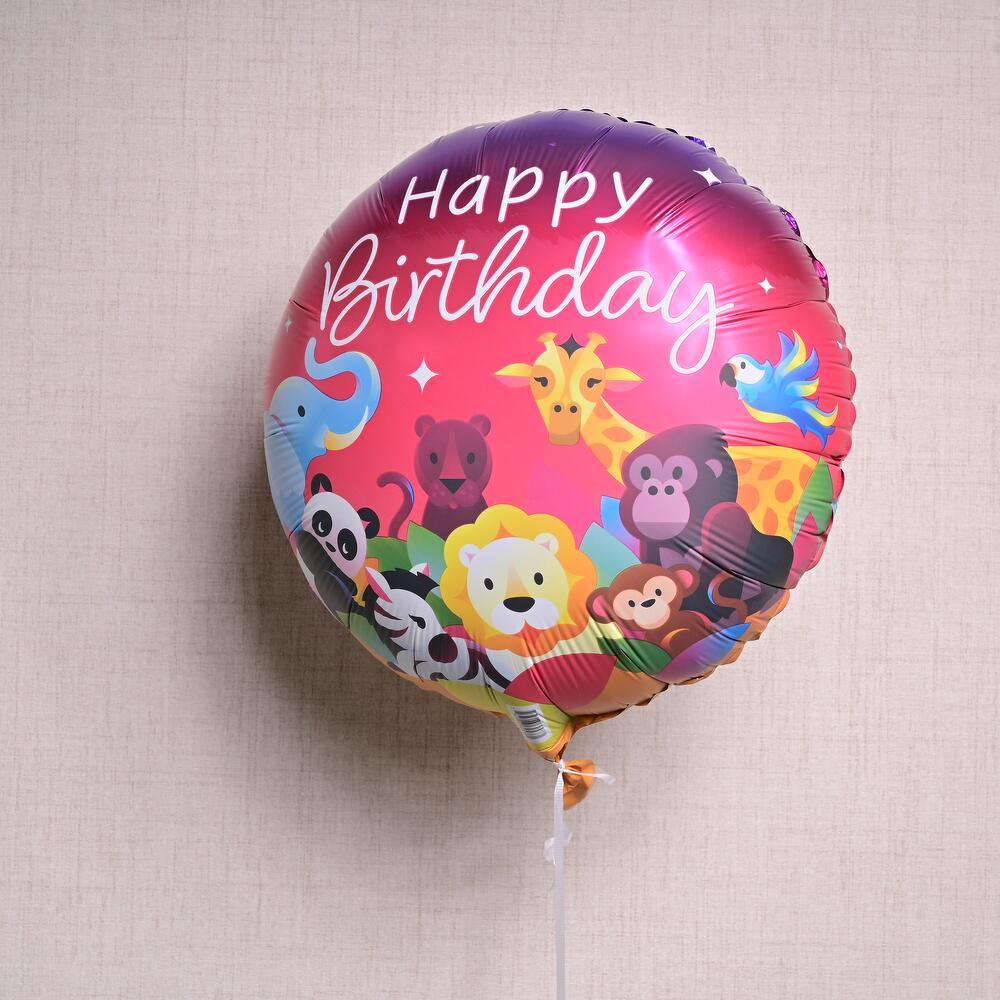 Globo de aluminio con temática de jungla, con adorables animales de safari y un vibrante diseño de "Feliz Cumpleaños". Lleno de helio y con peso en la base. Tiempo de flotación: 8-10 horas.