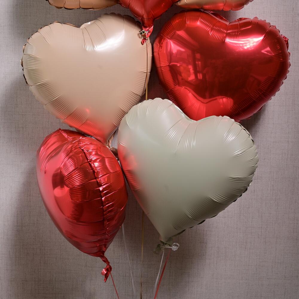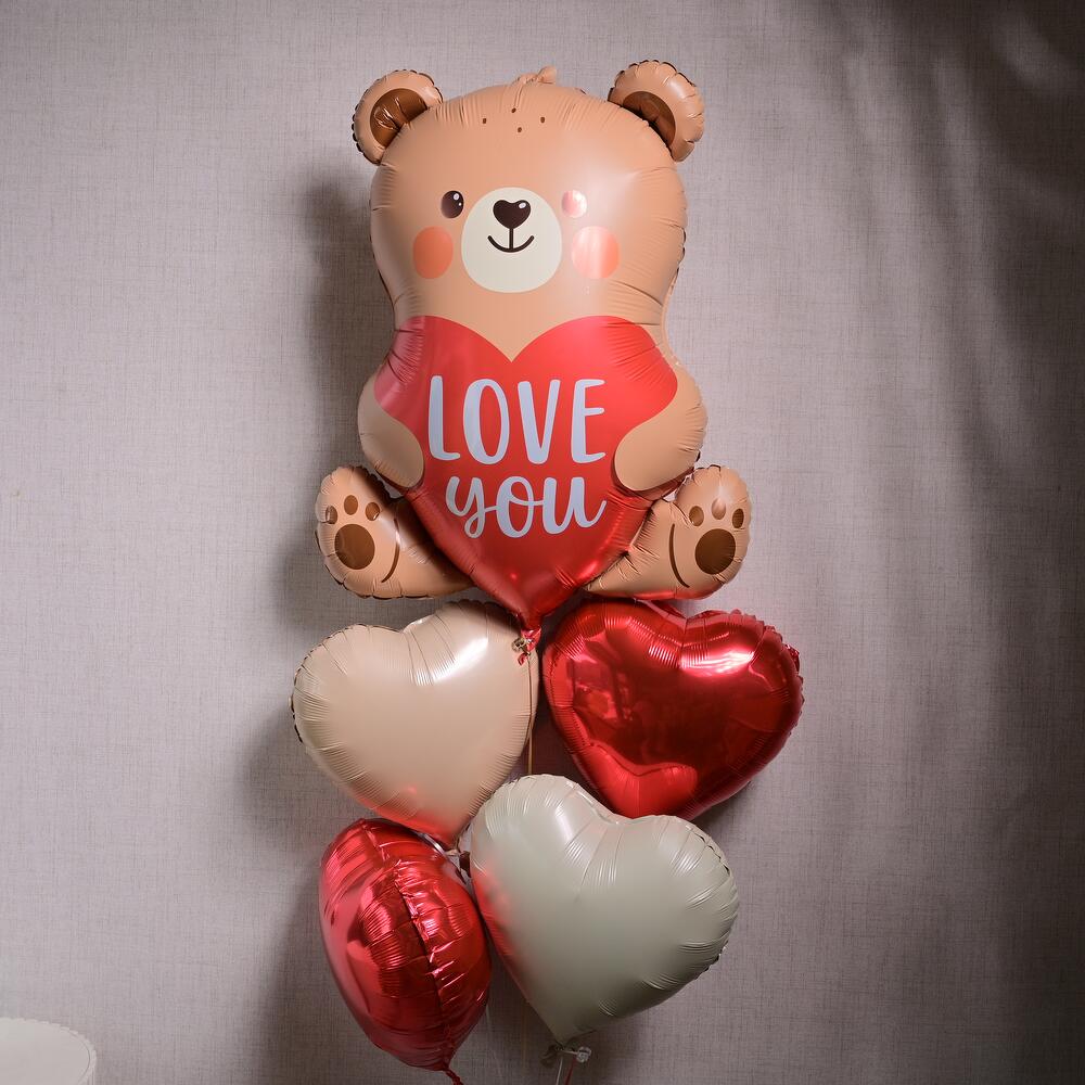 Set de globos con osito adorable con 1 globo grande metalizado con forma de osito y 4 globos con forma de corazón. Los globos se rellenarán con helio y llevarán un peso en la parte inferior. El helio durará entre 8 y 10 horas