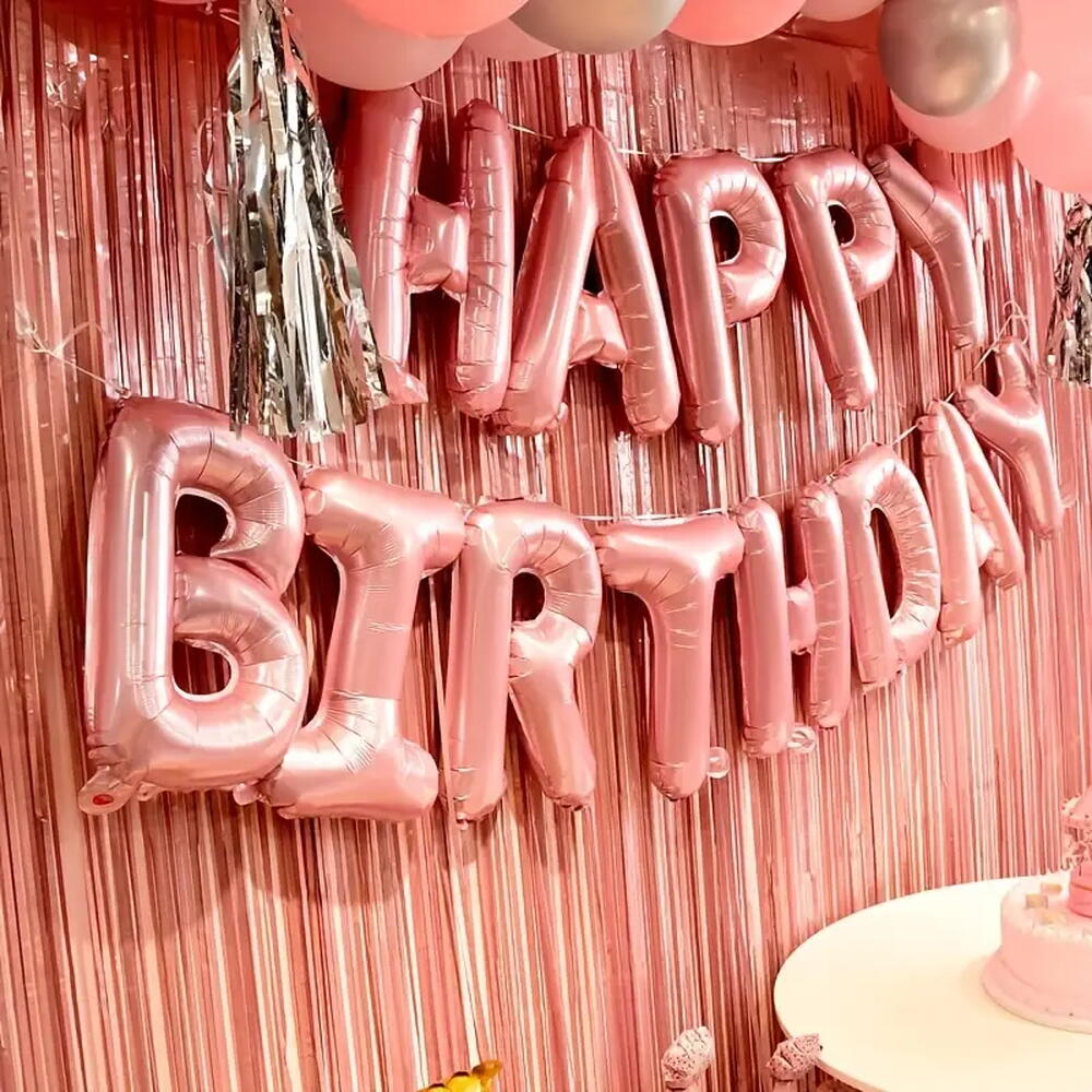 Transforma tu espacio en un escenario de cumpleaños glamuroso con una guirnalda de globos rosa con la frase 'Happy Birthday', globos metálicos y en tonos pastel, un globo de foil con forma de botella de champán y un telón de fondo brillante. Ideal para cumpleaños de niñas, mujeres o bebés.