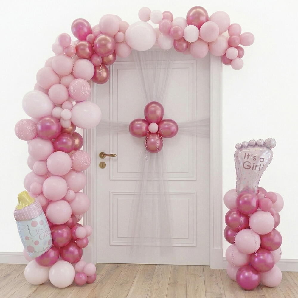 Create a soft and elegant welcome setup with this beautiful pink-themed balloon arrangement, perfect for celebrating the arrival of a newborn. Designed with a blend of fuchsia pink and light pink tones, this setup brings a warm, joyful, and charming atmosphere to your space. The arrangement includes 65 fuchsia pink and 65 light pink latex balloons (10 inches), along with 20 light pink balloons (5 inches) to add depth and fullness. A cute pink baby bottle foil balloon serves as a highlight, enhancing the baby-themed decor. The setup is completed with 3 meters of delicate tulle cloth, adding a graceful and premium touch. Ideal for hospital decorations, baby showers, or welcome home celebrations, this arrangement creates a lovely and memorable setting. *Customization is possible as per your preference.