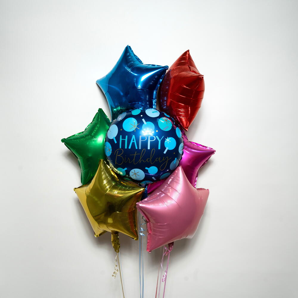 El set de globos estrella de temática azul premium (7balloons) añade un toque elegante y vibrante a cualquier celebración de cumpleaños. Incluye 1 globo redondo metalizado azul con la inscripción 'Happy Birthday' y 6 globos metalizados con forma de estrella en azul, rojo, verde, dorado y rosa. Perfecto para cumpleaños, decoración de fiestas y para lograr fotos vibrantes. El tiempo de flotación con helio es de aproximadamente 8–10 horas, ideal para celebraciones el mismo día 🎈✨