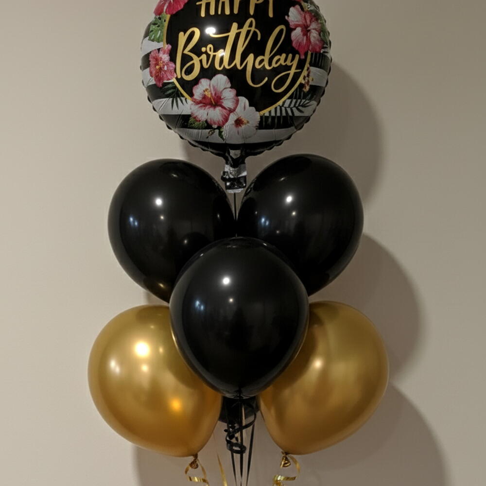 ¡Celebra con un toque de paraíso y elegancia! Nuestro ramo de globos Tropical Floral Happy Birthday presenta un impresionante globo foil a rayas en negro y blanco adornado con vibrantes flores de hibisco y la inscripción "Happy Birthday" en caligrafía dorada. Esta decoración única en negro y dorado se complementa a la perfección con una radiante mezcla de globos de látex dorados brillantes y negros mate. Ideal para fiestas con temática tropical, cumpleaños de adultos, celebraciones veraniegas o para quien ama los toques chic y vibrantes. Compra globos premium de helio con entrega para un evento inolvidable.