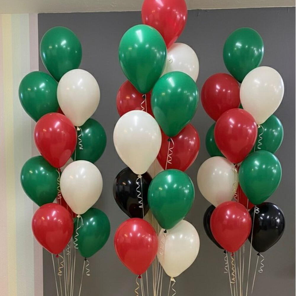 Eleva la decoración de tu evento con este conjunto festivo de tres ramos de globos de helio, con los orgullosos colores de la bandera de los Emiratos Árabes Unidos: rojo vibrante, verde exuberante, blanco nítido y negro sofisticado. Total 36 globos (9 por color)