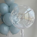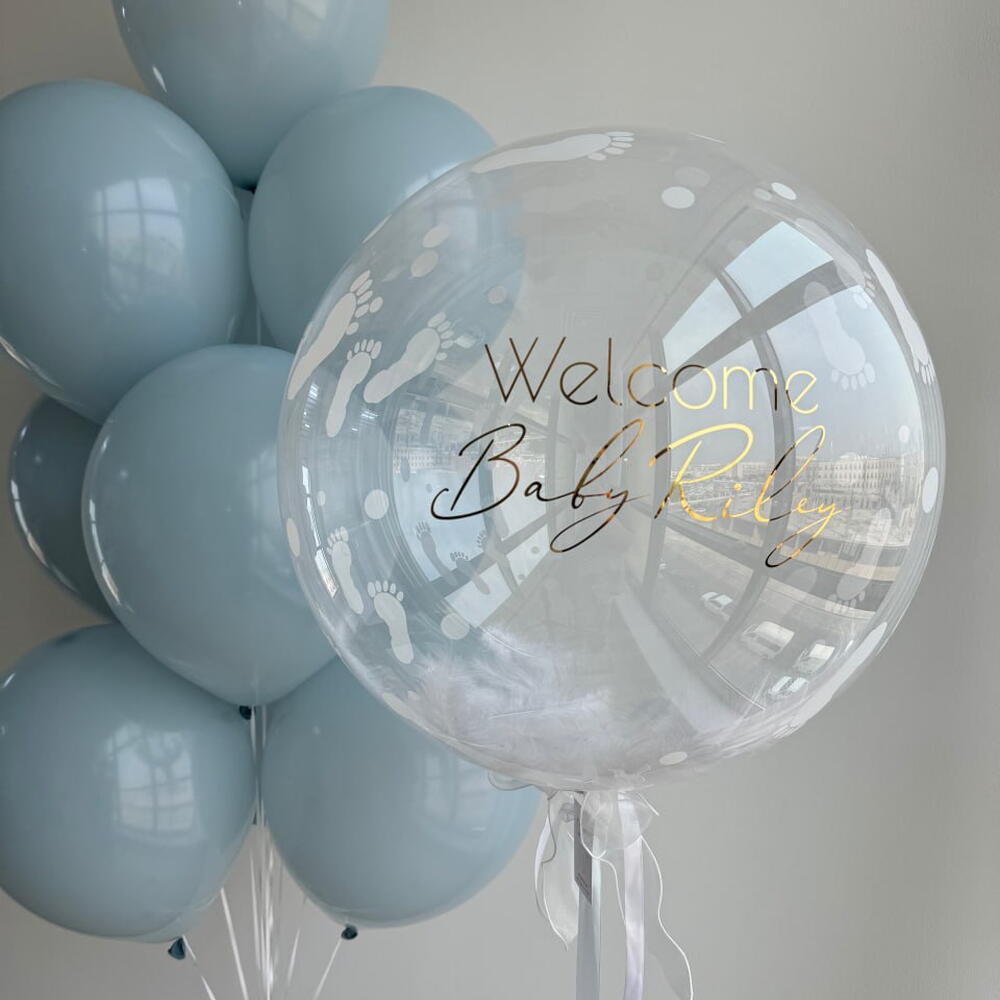 Globo burbuja con pies impresos + texto personalizado 10 globos lisos azul bebé
