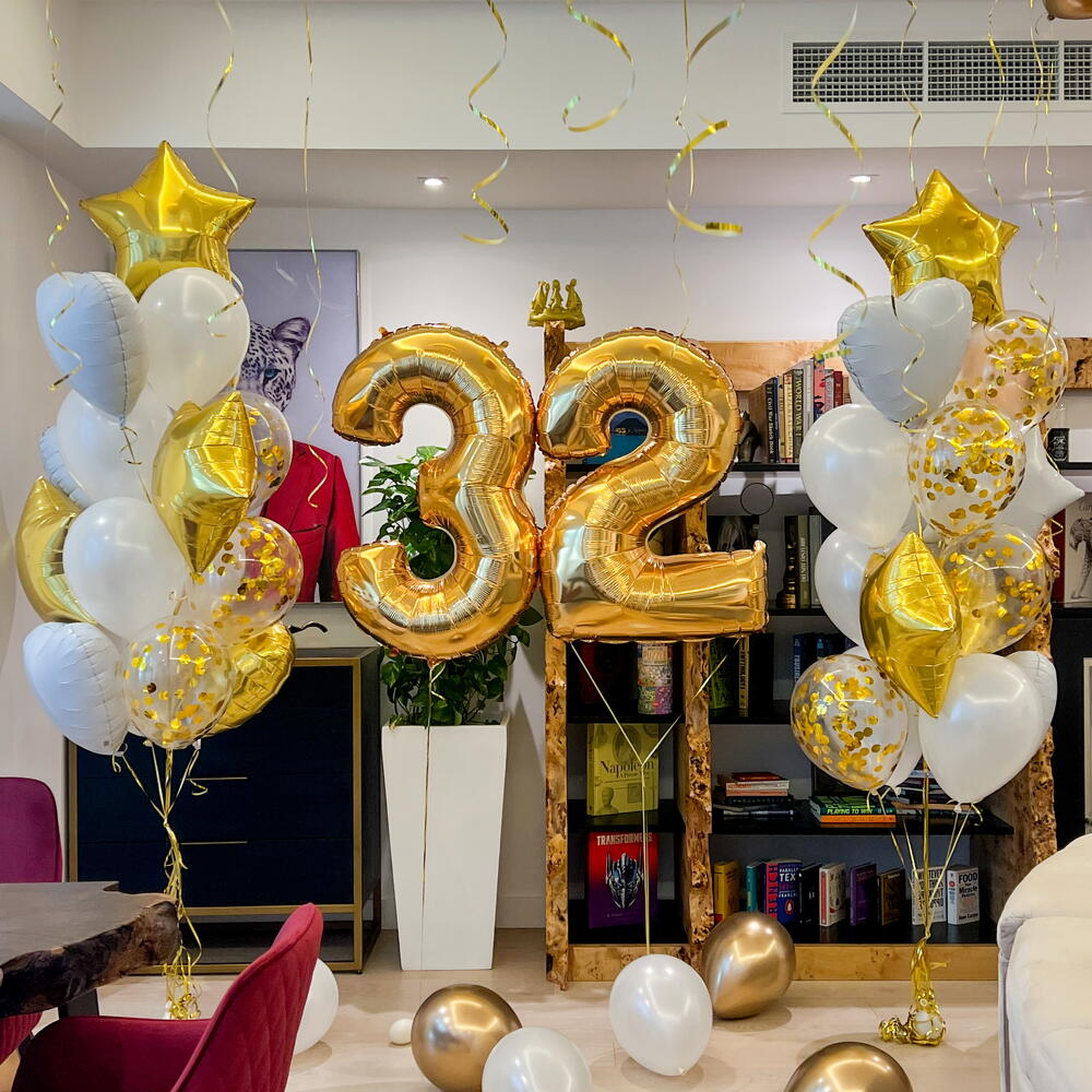 El juego incluye: - 2 números - 2 ramos de 16 globos cada uno (7 globos de aluminio, 4 de confeti y 5 de látex por ramos)