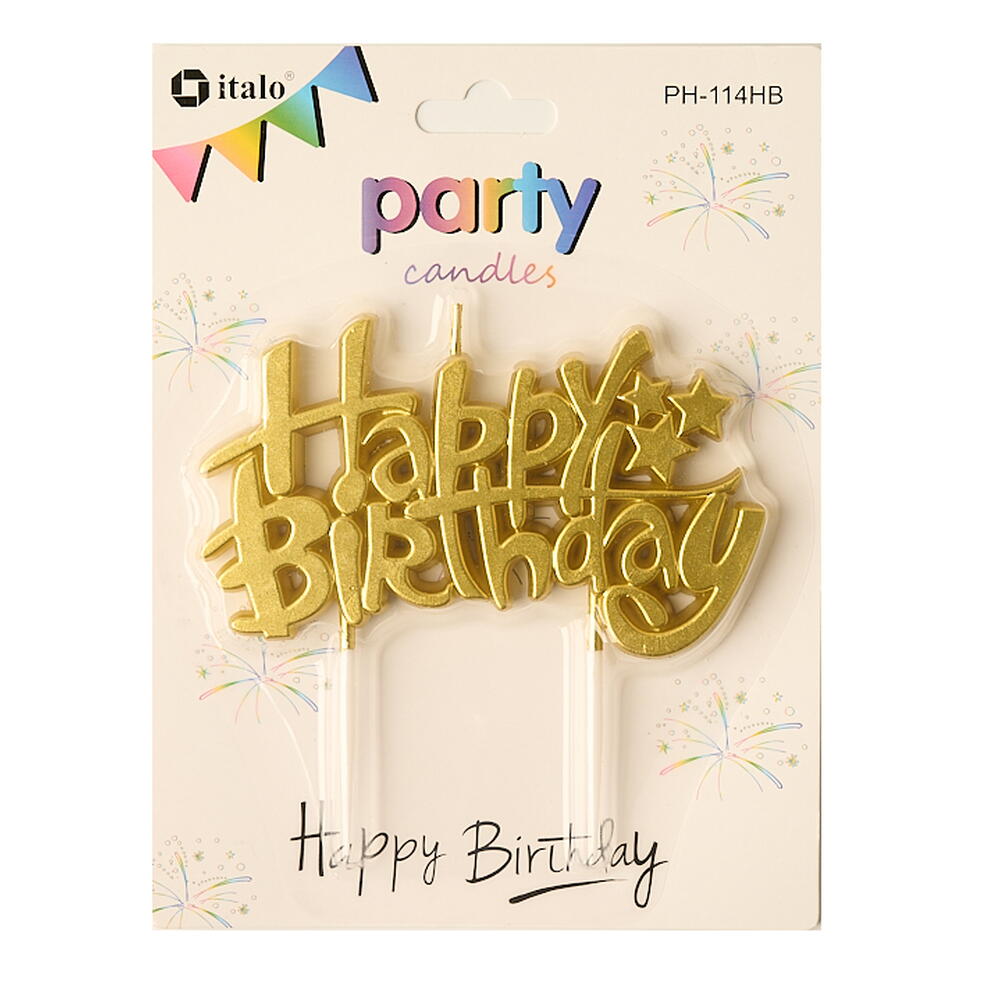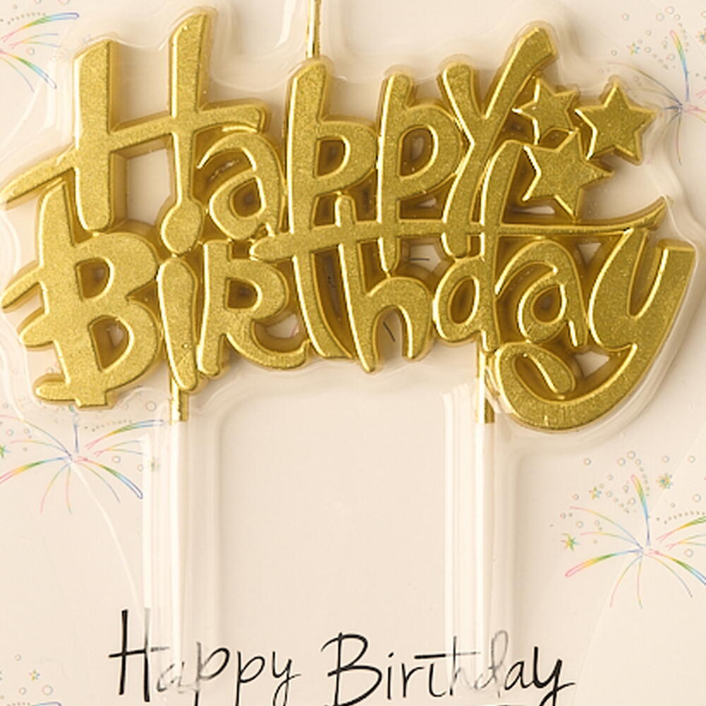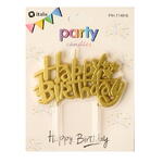 Adorno para pastel con vela 'Happy Birthday' en color dorado.