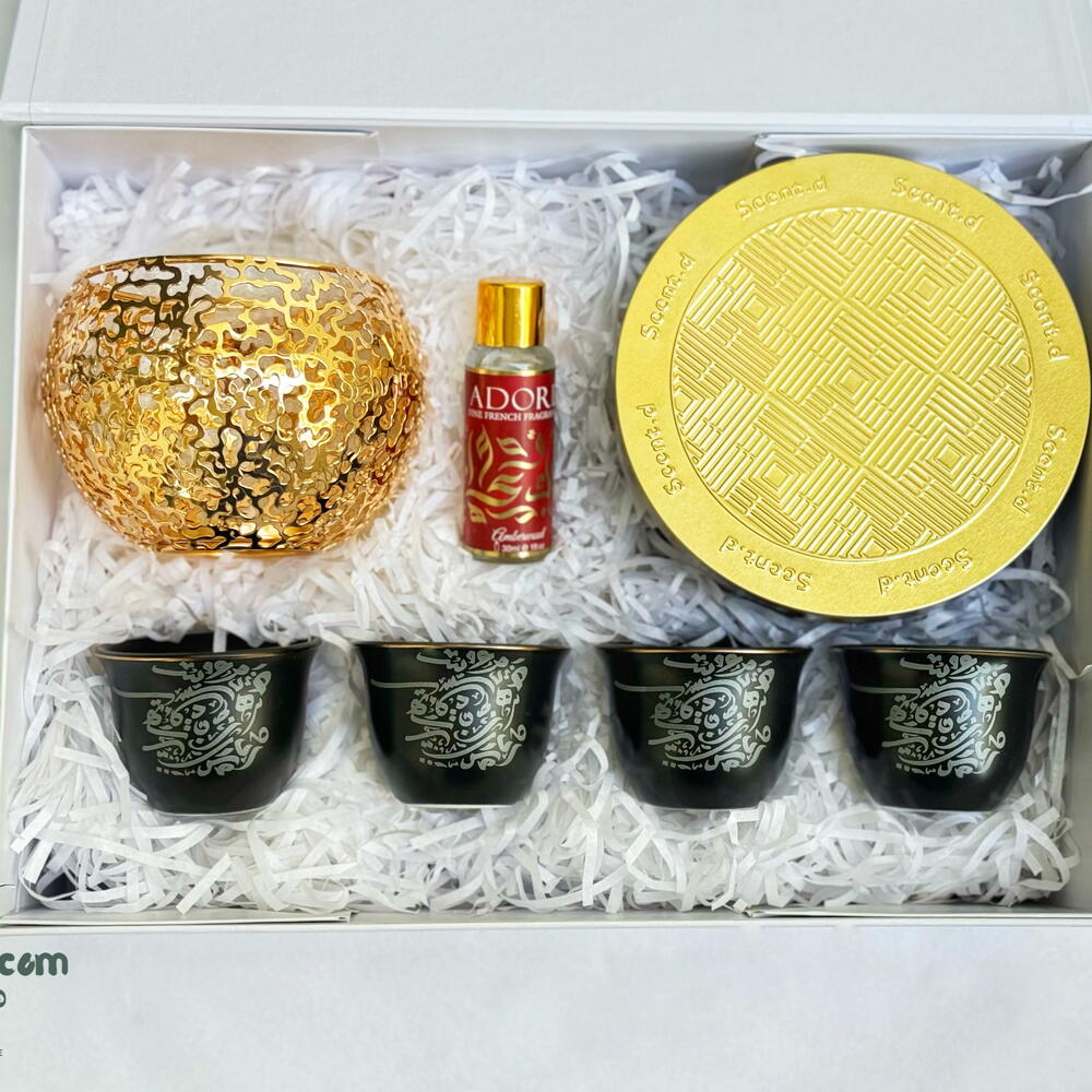 A timeless gift set inspired by the elegance of Arabian evenings. The Amber Nights box brings together luxurious ambiance and cultural charm — perfect for gatherings, thank-you gifts, or thoughtful home décor. What’s inside (5 pieces): • Golden Oil Burner • 3-Wick Scented Candle • 4x Arabic Coffee Cups (Black with gold accents) • Aromatherapy Burner Oil (Oud & Floral blend) • Premium White Gift Box with Olive Ribbon Crafted for elevated gifting with a touch of golden warmth.