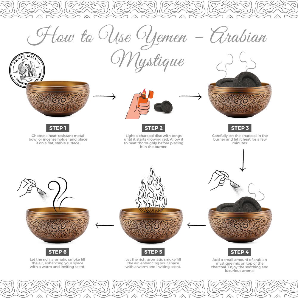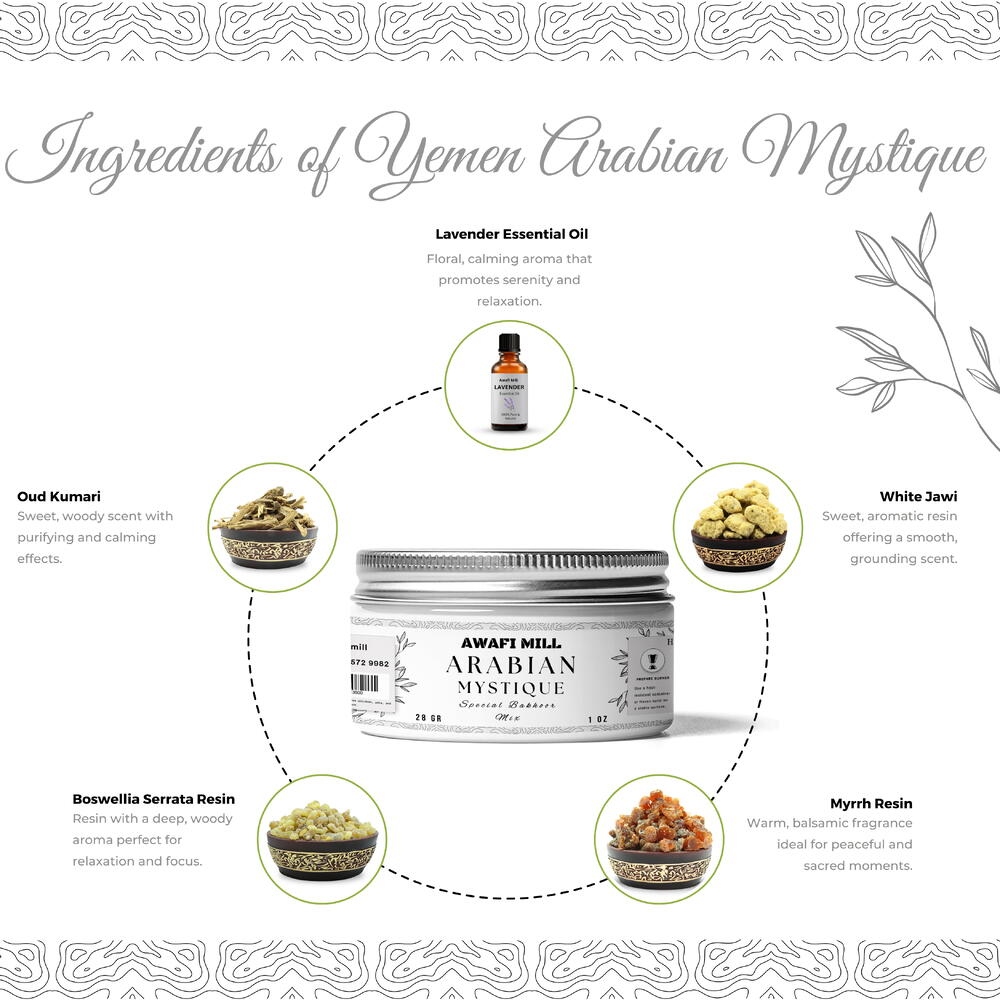 Oud kumari, boswellia serrata resin, white jawi, myrrh resin, and lavender essential oil to create a rich, exotic aroma. This mix evokes the mystical essence of ancient arabian incense rituals. Ideal for creating a calming, spiritual atmosphere, this incense mix is perfect for meditation, relaxation, or enhancing the mood of any room. Perfect for spiritual rituals, prayer ceremonies, or simply elevating your home with a warm, mystical fragrance.
