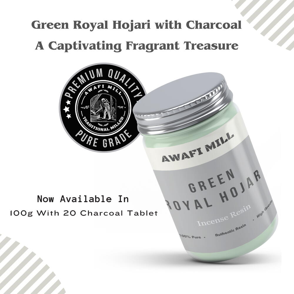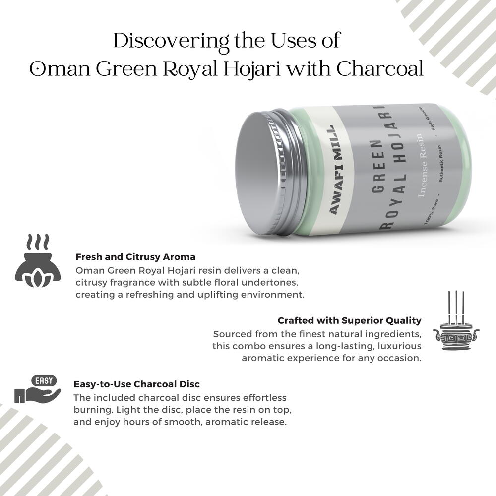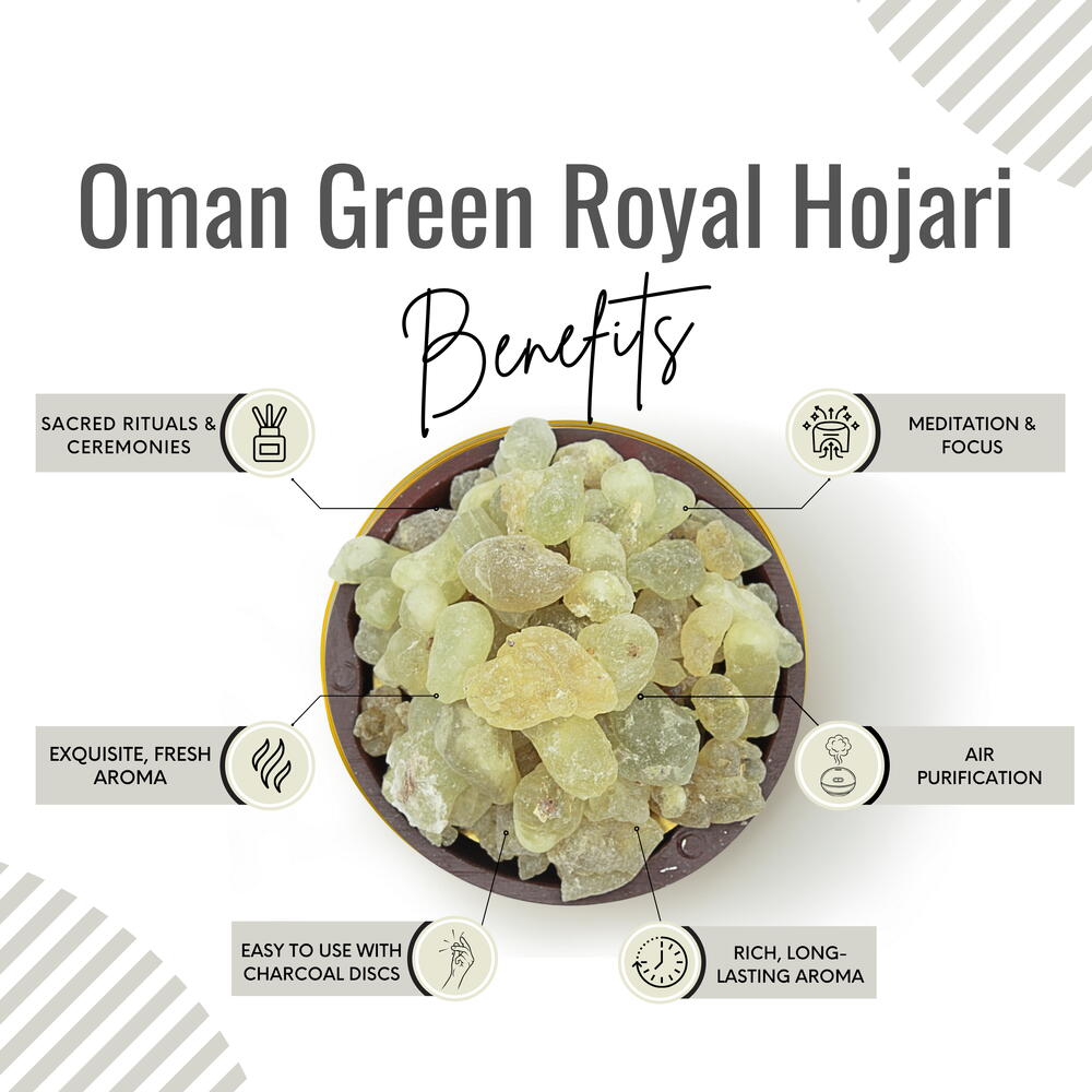 Includes triangle charcoal tablet for convenient and efficient burning Oman green hojari, renowned for its beautiful green hue Crafted with care, each resinous piece offers a mild yet captivating aroma that fills your space with tranquility Long-lasting fragrance ensures a lasting ambiance, perfect for meditation, relaxation