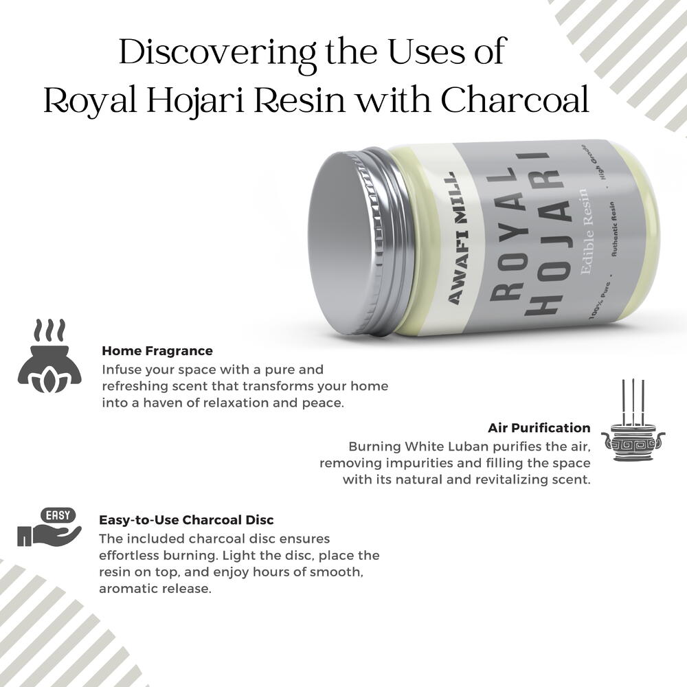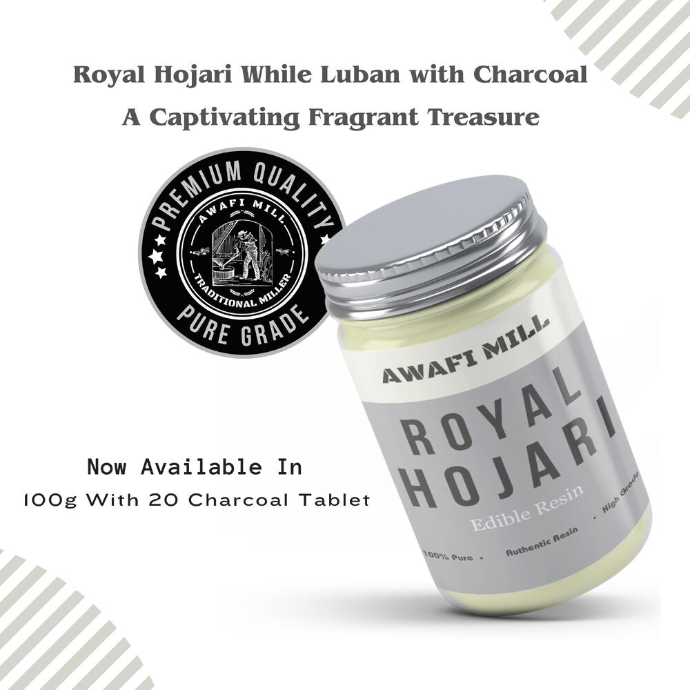 Awafi Mill presenta Royal Hojari Gum Luban Frankincense, un testimonio de la opulencia y la grandeza de los árboles Boswellia sacra que se encuentran en los ásperos paisajes de Omán. Proveniente de las mejores regiones productoras de resina, cada pieza resinosa encarna la esencia del lujo y la sofisticación. Incluida con el incienso viene una tableta de carbón triangular, especialmente diseñada para una combustión fácil y eficiente. Simplemente coloque la tableta en un recipiente resistente al calor o en un soporte para incienso, enciéndala con una cerilla o un encendedor y espere a que arda completamente antes de añadir cuidadosamente el incienso encima. El resultado es una liberación constante y uniforme de fragancia que envuelve su entorno en una sensación de majestad y encanto.