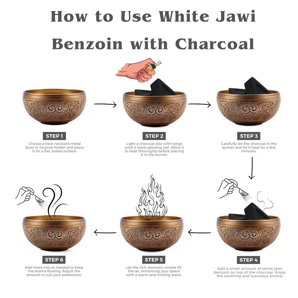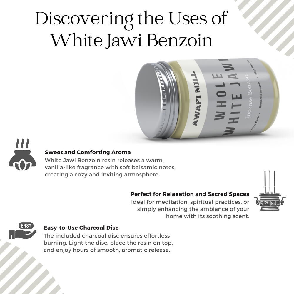 Includes triangle charcoal tablet for easy and efficient burning White jawi benzoin natural incense, known for promoting prosperity, abundance, and clarity Each stick exudes a fragrant aura that uplifts the ambiance and enhances focus Perfect for meditation, spiritual practices, or simply creating a serene atmosphere White jawi benzoin and experience the transformative power of its uplifting properties