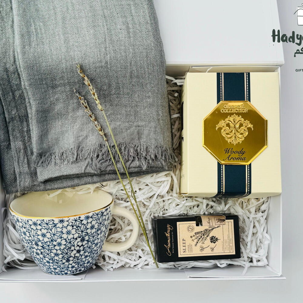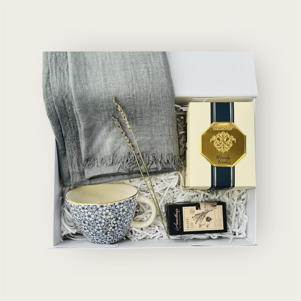 A cozy and elegant gift box crafted for serene moments and meaningful gifting. The Whisper & Warmth box includes soft textures, soothing aromas, and refined touches—perfect for thank-you gifts, evening rituals, or self-care moments. What’s inside (4 pieces): • Large Luxury Candle – Woody Aroma • Elegant Ceramic Mug (Japanese-style) • Soft Lightweight Scarf (Muted Grey) • Aromatherapy Essential Oil – “Sleep” blend Beautifully packed in a premium box with an olive green ribbon for a sophisticated touch.
