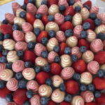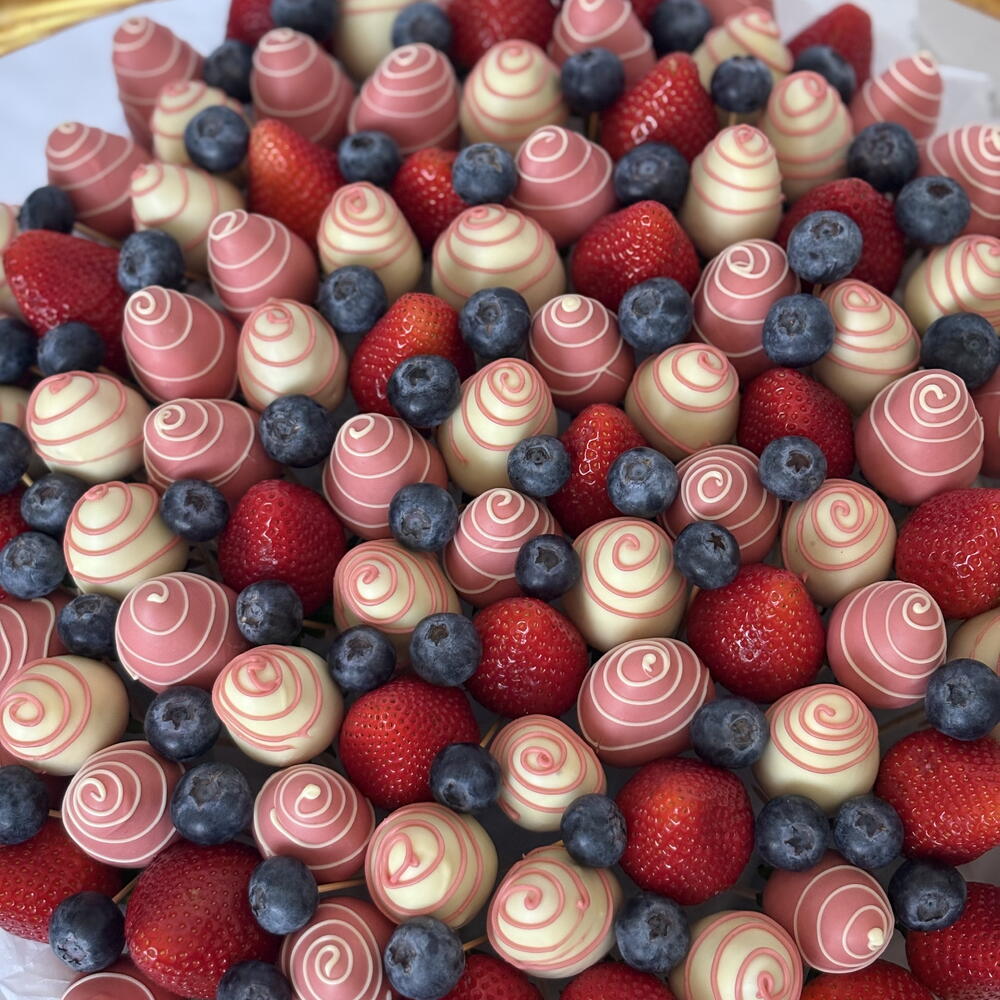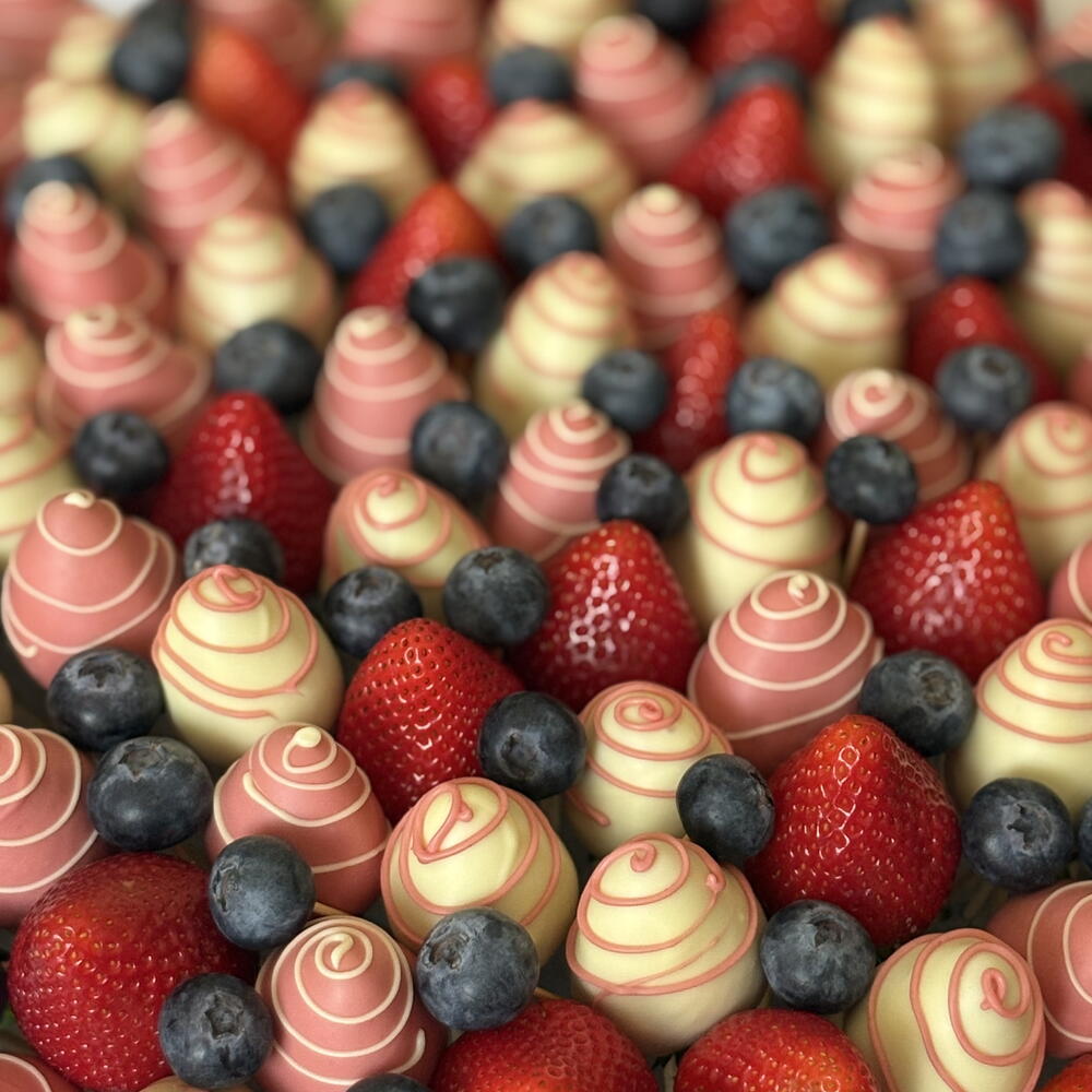 Ingredientes del postre: fresas frescas; chocolate con leche Berry Callebaut (azúcar, manteca de cacao, leche entera en polvo, pasta de cacao, emulgente: lecitina de soja, aroma natural: vainilla). Chocolate blanco Berry Callebaut (azúcar, manteca de cacao 27,4%, leche entera en polvo, emulgente: lecitina de soja, aroma natural: vainilla). Elementos de diseño: fresas frescas, arándano. ***Utilizamos chocolate Callebaut en todos nuestros productos. ***Las fresas frescas se esterilizan y lavan.