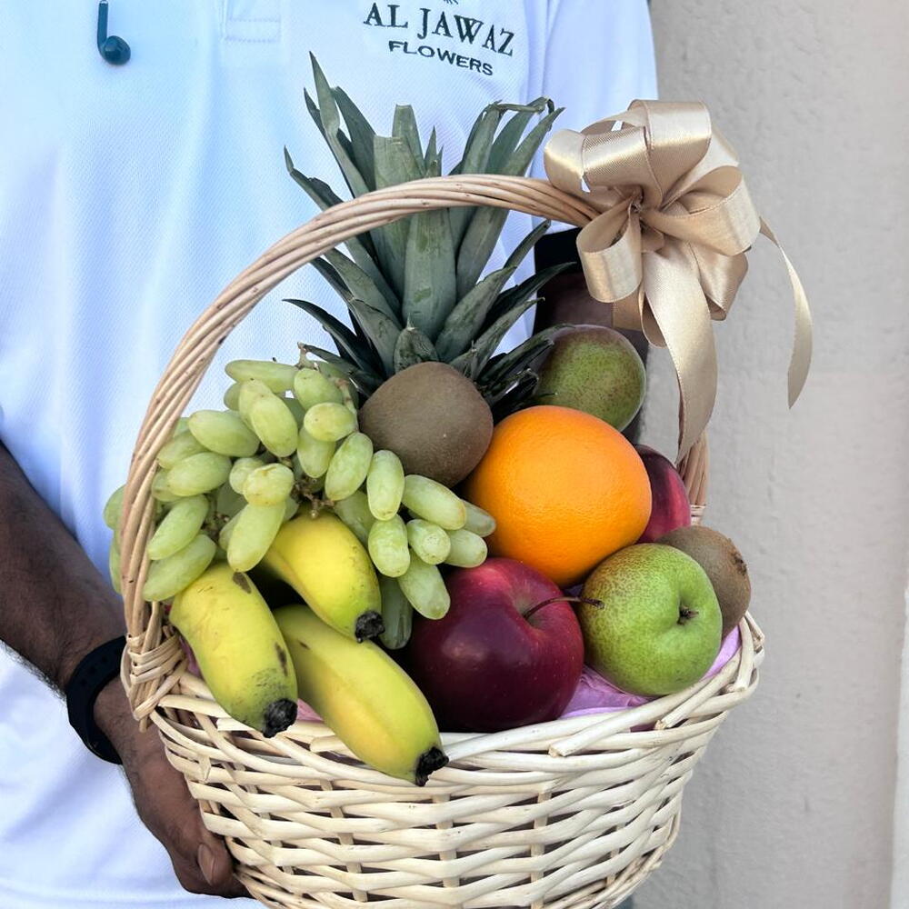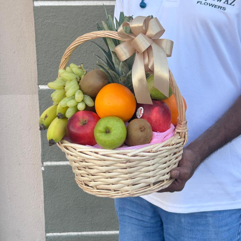 Basket - 1 ud. peras - 2 ud. kiwi - 3 ud. banana - 3 ud. naranja - 3 ud. manzana roja - 2 ud. uvas verdes - 1 ud. piña - 1 ud.