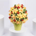 3 piñas 1,5 kg de melón 500 g de fresas 100 g de col rizada Preciosamente colocadas en una maceta de cerámica verde