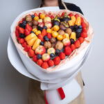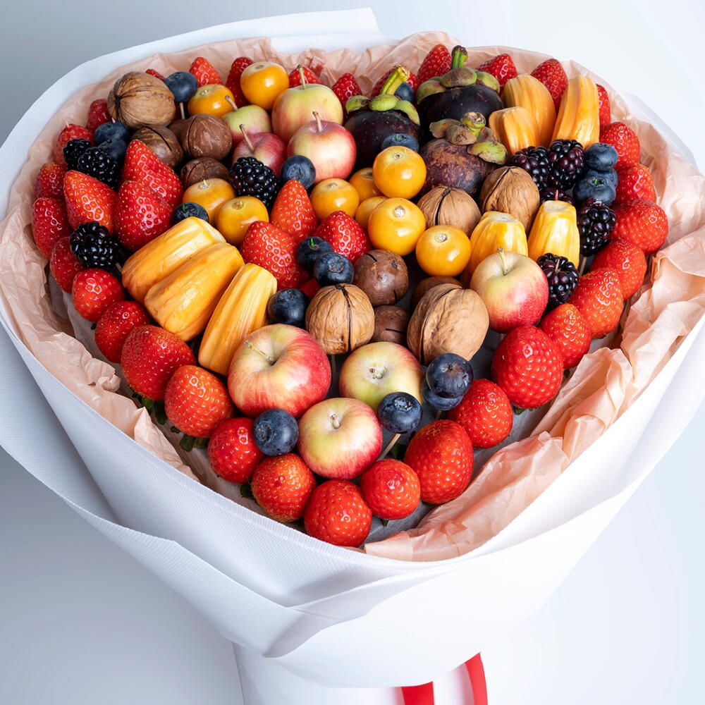 Un ramo de frutas en forma de corazón con frutas premium. Todas las frutas son de temporada y podemos sustituir las frutas por otras de la misma categoría si no están disponibles las mismas frutas.