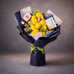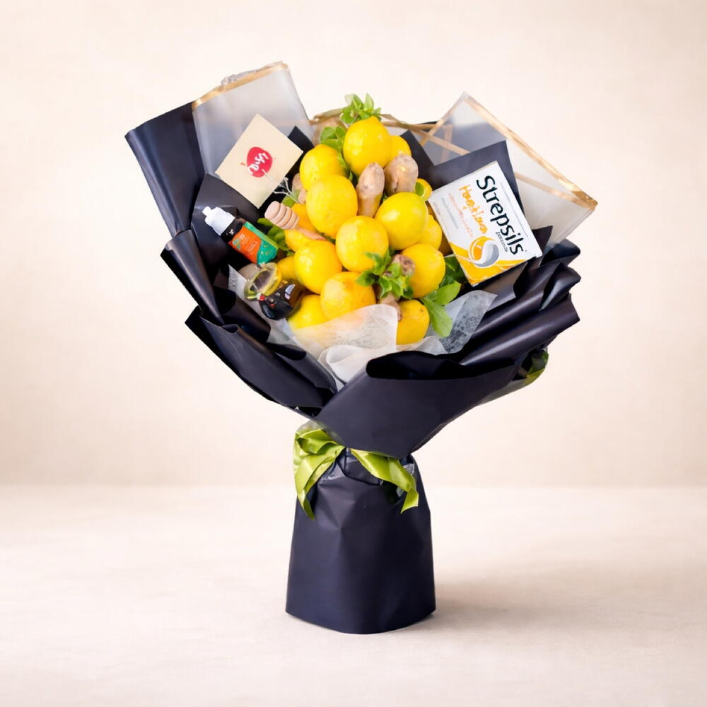 Este vibrante ramo presenta una encantadora disposición de limones frescos complementados con jengibre, hojas de menta y una selección de elementos reconfortantes como miel y pastillas herbales. Envuelto elegantemente en papel oscuro con un toque de cinta verde, es un regalo llamativo y aromático, perfecto para alegrar el día de alguien aportando alivio o para ofrecer consuelo.