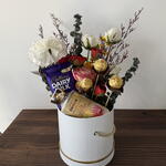 Deleita tus sentidos y sorprende su paladar con este exquisito ramo de flores de chocolate. Esta cuidada composición combina tres deliciosos chocolates Rocher —cada uno una dulce sinfonía de crocancia y cremosidad—. Acompañado de una sola pieza de delicioso chocolate Dairy Milk, conocido por su irresistible textura aterciopelada. Para añadir aún más atractivo, hemos incluido una loción premium de Bath and Body, garantizada para calmar y suavizar la piel mientras la envuelve en una fragancia placentera. Este conjunto único está listo para satisfacer tanto el antojo de dulces como el deseo de cuidado personal. Perfecto para cualquier ocasión y seguro de ser recordado.