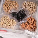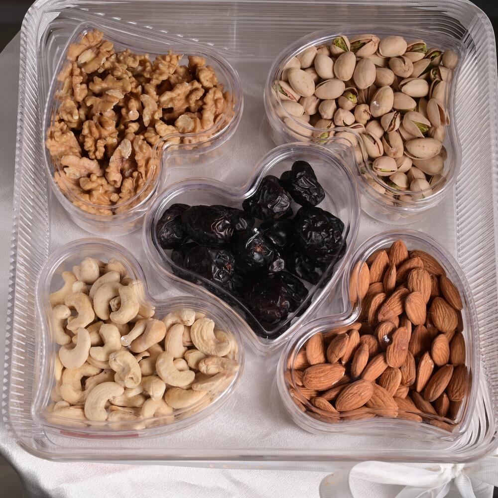 dátiles - 150 gr nueces - 125 gr bandeja acrílica - 1 ud. anacardos - 125 ud. pistachos - 150 gr almendras naturales - 150 gr caja acrílica en forma de corazón - 5 ud.