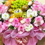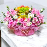 Una gran canasta decorativa de frutas y flores. El arreglo se presenta en una canasta redonda y rosa envuelta en una tela de malla rosa traslúcida con un gran lazo rosa. Presenta una variedad de flores rosas y blancas, incluidas rosas, que rodean un arreglo central de frutas frescas. Las frutas visibles incluyen uvas verdes, naranjas, kiwis y un melón