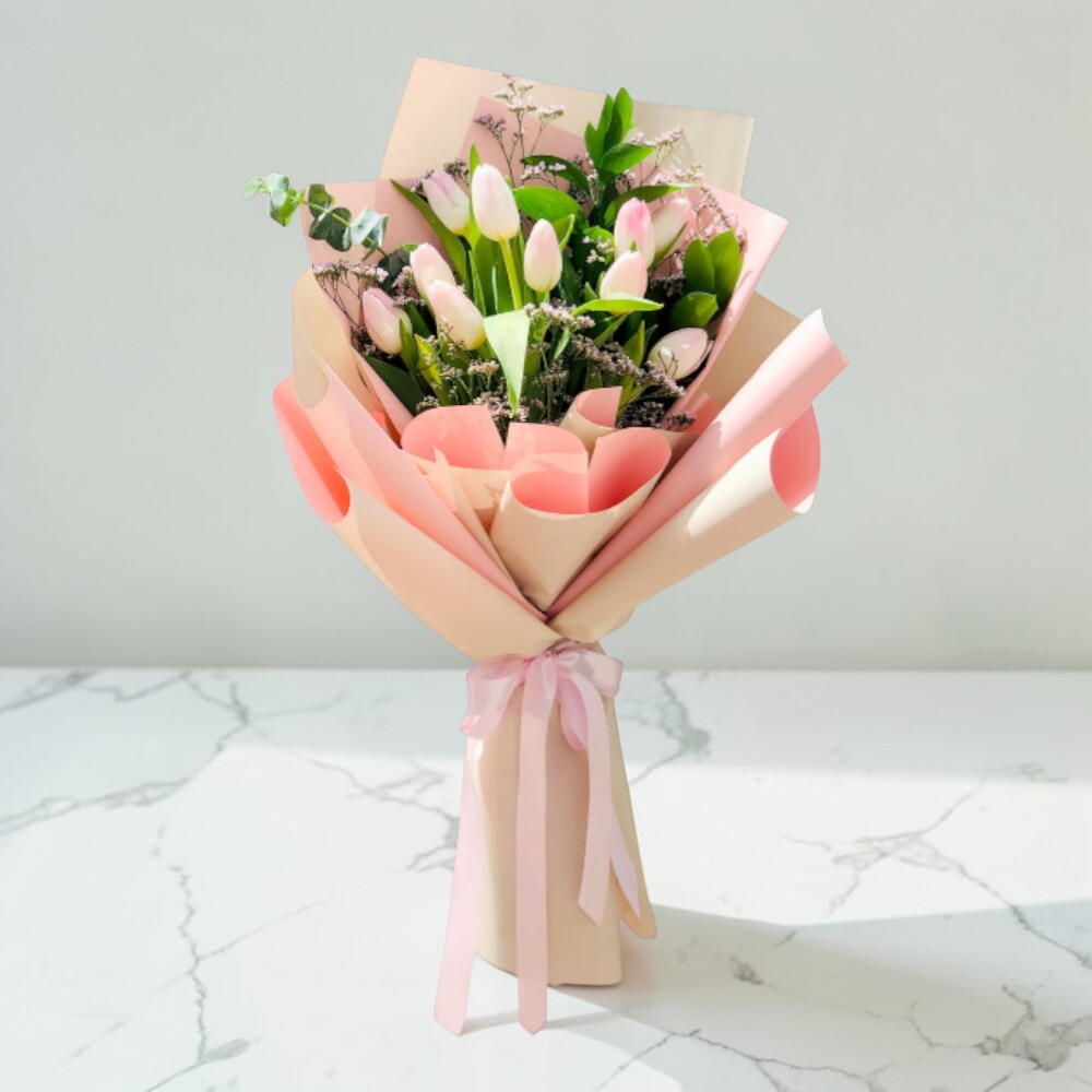 Ramo de 10 tulipanes rosas con rellenos en un bonito envoltorio. Precioso ramo de 10 tulipanes rosas arreglados con rellenos suaves y envueltos en un elegante papel premium para un aspecto estilizado. Este ramo de flores rosas es perfecto para cumpleaños, aniversarios y sorpresas emotivas. Flores frescas, recolectadas a mano, ofrecen un encanto delicado y un atractivo duradero. Consejo de cuidado: Recorta los tallos, colócalos en agua limpia y manténlos en un lugar fresco, lejos de la luz solar directa. Cambia el agua cada 2 días para mantener la frescura y alargar la vida del ramo.
