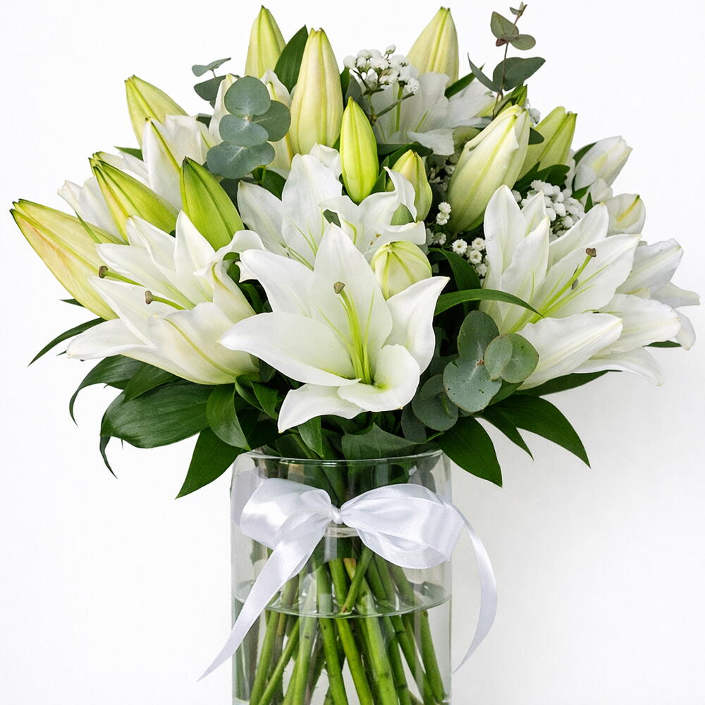 Un arreglo refinado de 11 lirios blancos inmaculados combinados con eucalipto fresco, presentado en un jarrón de vidrio transparente. Limpio, grácil y con una elegancia sin esfuerzo — esta pieza floral es perfecta para cumpleaños, inauguraciones de casa, regalos de agradecimiento o para realzar cualquier espacio con una sofisticación serena. Recién arreglado y entregado con cuidado para momentos que merecen un lujo discreto.